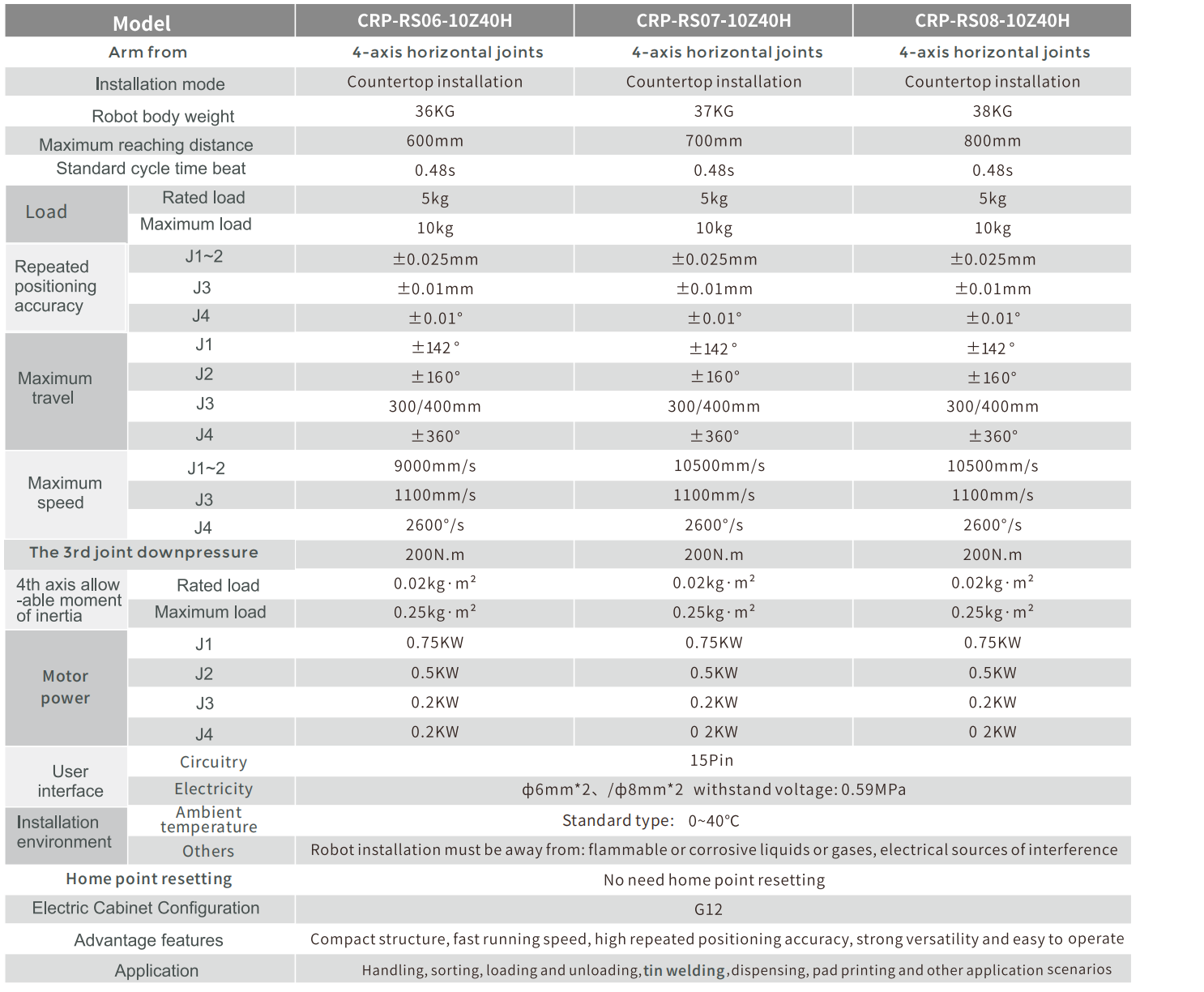 Available in 800mm arm length specifications, up to 10kg payload, rated payload of 5kg.