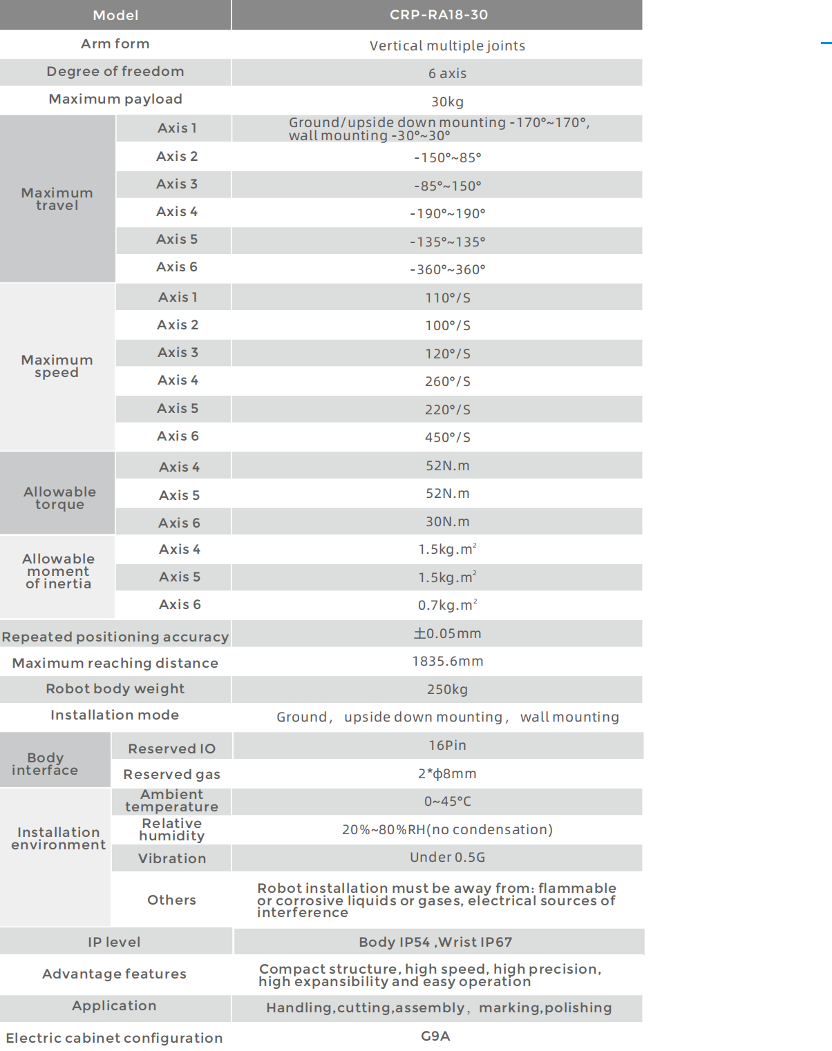 • The design of the robot is highly compact, which is more light weight, especially the wrist is slender, so it can be applied in more scenarios.