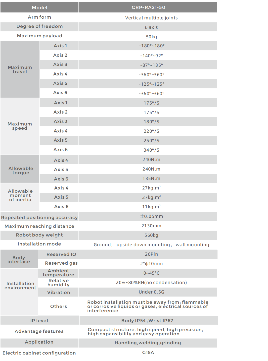 • Arm span of 2.13m, strong load capacity, large working range and high flexibility. Fast operation speed, repeated positioning accuracy, suitable for handing, assembly, grinding and other scenarios.